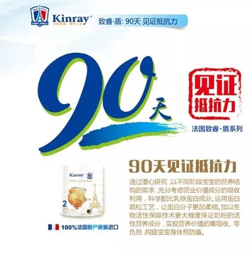 基于对消费者负责的严瑾态度,kinray致睿盾400g系列产品专门针对抵抗力弱的宝宝,特别添加丰富的乳铁蛋白增加宝宝抵抗力,为避免宝宝哺育期间的二次污染,提升抵抗力实际增强效果,kinray致睿中国区品牌授权方:全球知名乳企法国诺帝柏欧公司建议产品上市初期使用400克小听装。近山识鸟声,近水识鱼性,产品上市初期也要考虑到中国市场现状,了解中国妈妈的实际需求迎合中国宝宝的口味,同时强调配方的精准受众面,待400克小听装上市6-9个月后,在终端产生良好的口碑成为受众记忆度NO1,能够自发的产生口碑效应同时根据中国市场反馈的各项数据综合评估后,兼顾感性与理性在考虑全新上市800或900克装。