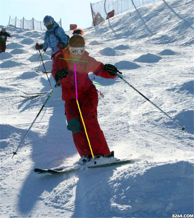 在慢速滑行熟练后,逐步放开速度,同时牢固地锁定肩线和肘线。在图2中veve的肩线(绿线)虽然与滚落线垂直,但却向山下倾斜没有与雪道平行,这是常见的问题,必须纠正。肩线与滚落线垂直使上身面对山下,与雪道平行让上身端正。肘线的要求和肩线是一样的,固定的肘线进一步限制了上身只能有小臂和腕可以运动。图3中浪客剑心的“反拧”就象教科书一样标准:肩线和肘线位置和谐,小臂与腕构成锤击式点杖,抬头目视前方,整个动作规范而流畅。