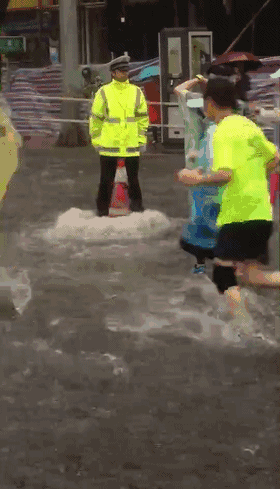 4月9日,2017年横店马拉松赛遭遇暴雨天气干扰。赛道上有3个窨井盖被倒灌的雨水顶起,执勤交警发现了潜在的巨大危险,为保证选手安全,3名交协警站在窨井盖上充当警示桩,一站就是两个多小时,直到确保所有参赛选手都顺利通过。